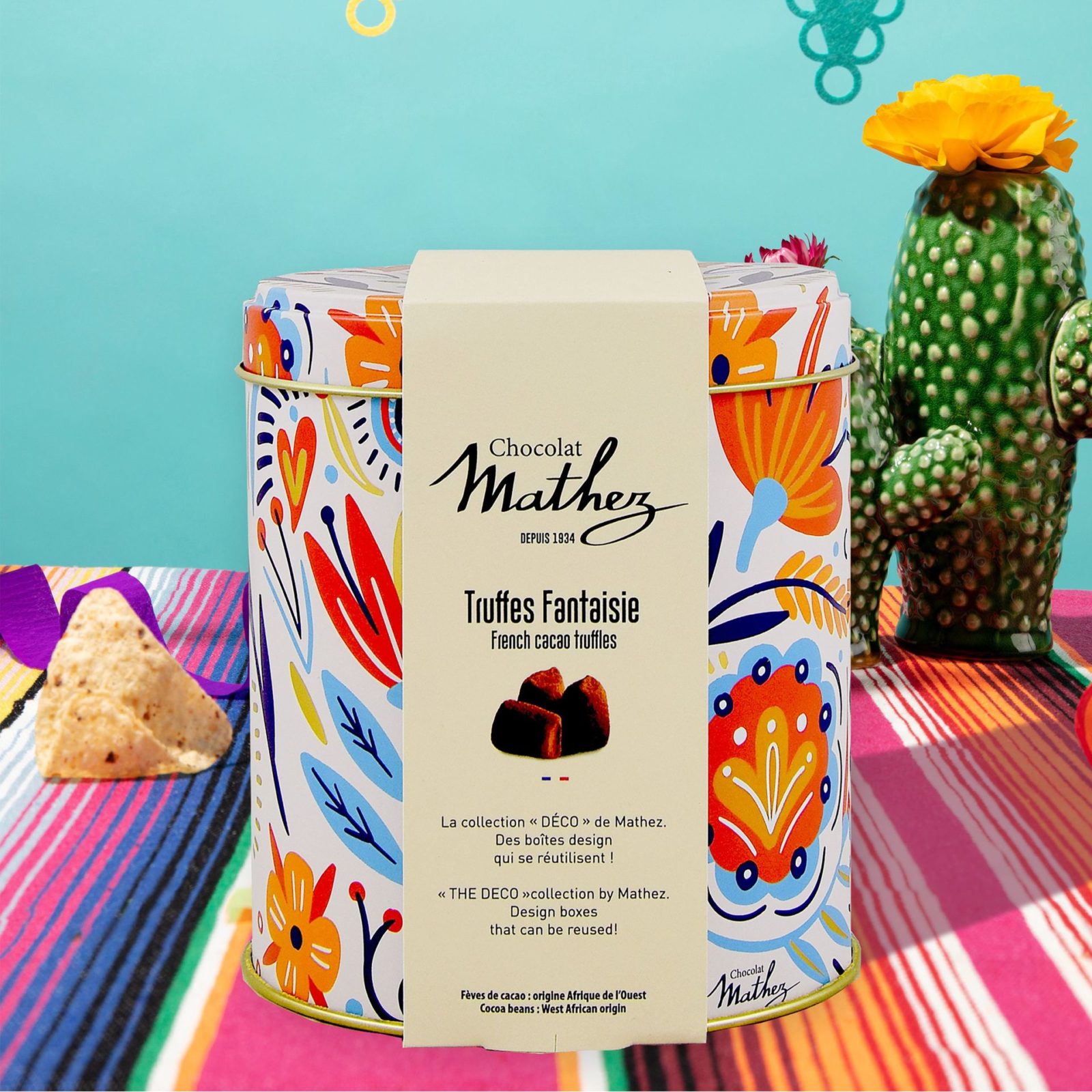 Chocolat Mathez vous propose ses truffes Fantaisie aux éclats de caramel au beurre salé, présentées dans sa nouvelle boîte métal «Mexico» qui vient enrichir la gamme et qui, une fois encore, frappe avec sa touche d’originalité. Produit sans huile de palme.