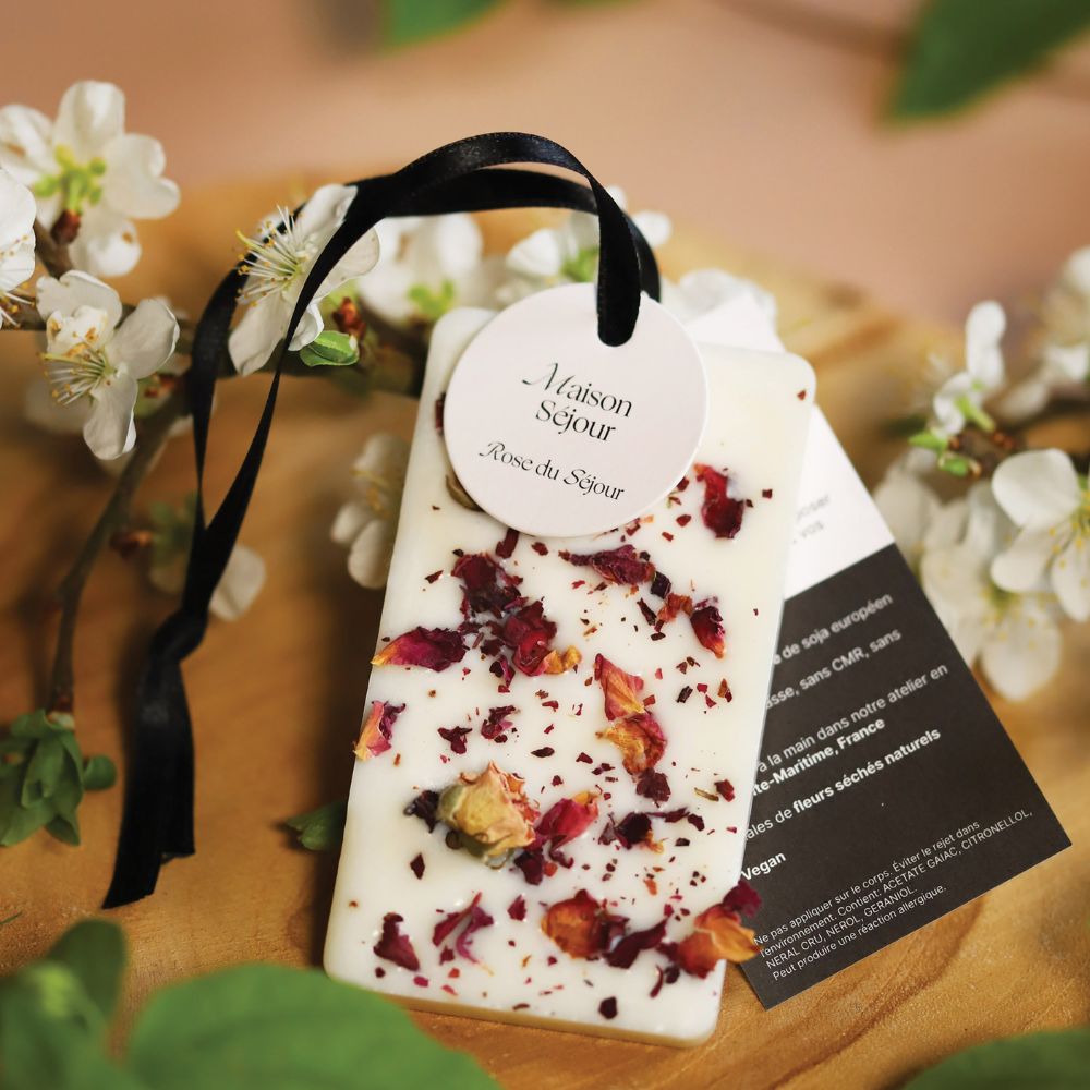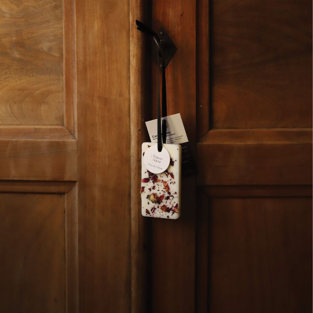 Parfumez votre intérieur de façon éco-responsable et saine avec cette carte en cire à suspendre coulée et décorée à la main dans notre atelier charentais. Notre carte florale à la Rose du Séjour est une suspension en cire végétale de soja qui décore et parfume délicatement vos placards et petits espaces. Accrochée par son ruban de satin ou simplement posée, elle diffusera son parfum de rose pendant plusieurs mois.